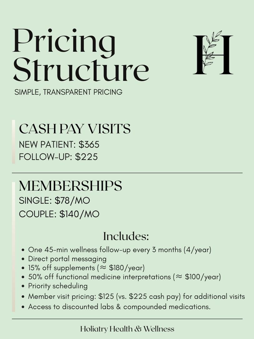 Example: New Patient Visit + Wellness Membership = $365 - $78 = $287 for initial visit to establish care and enroll in membership.